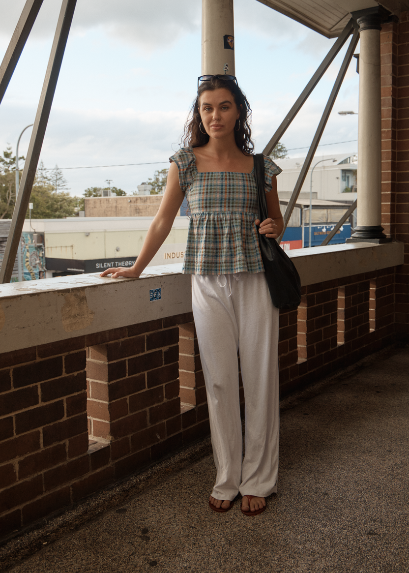 The Amelie Check collection is crafted from lightweight, 100% organic cotton seersucker. Its subtle texture and breathable fabric make it a season long favourite. This top is designed with a fitted bodice, elasticated shirring at the back for a secure fit, flutter sleeves, and a gathered peplum for a feminine finish.