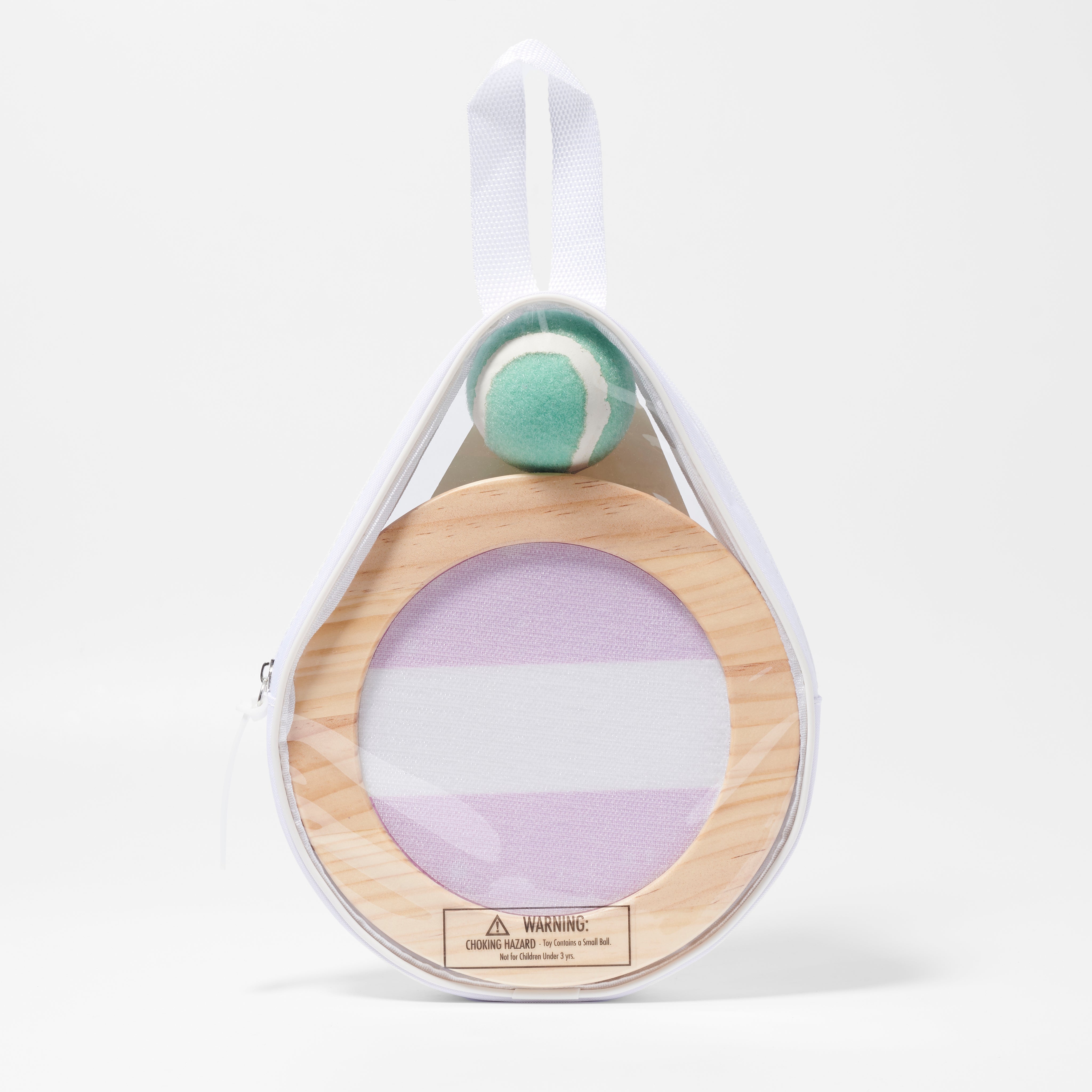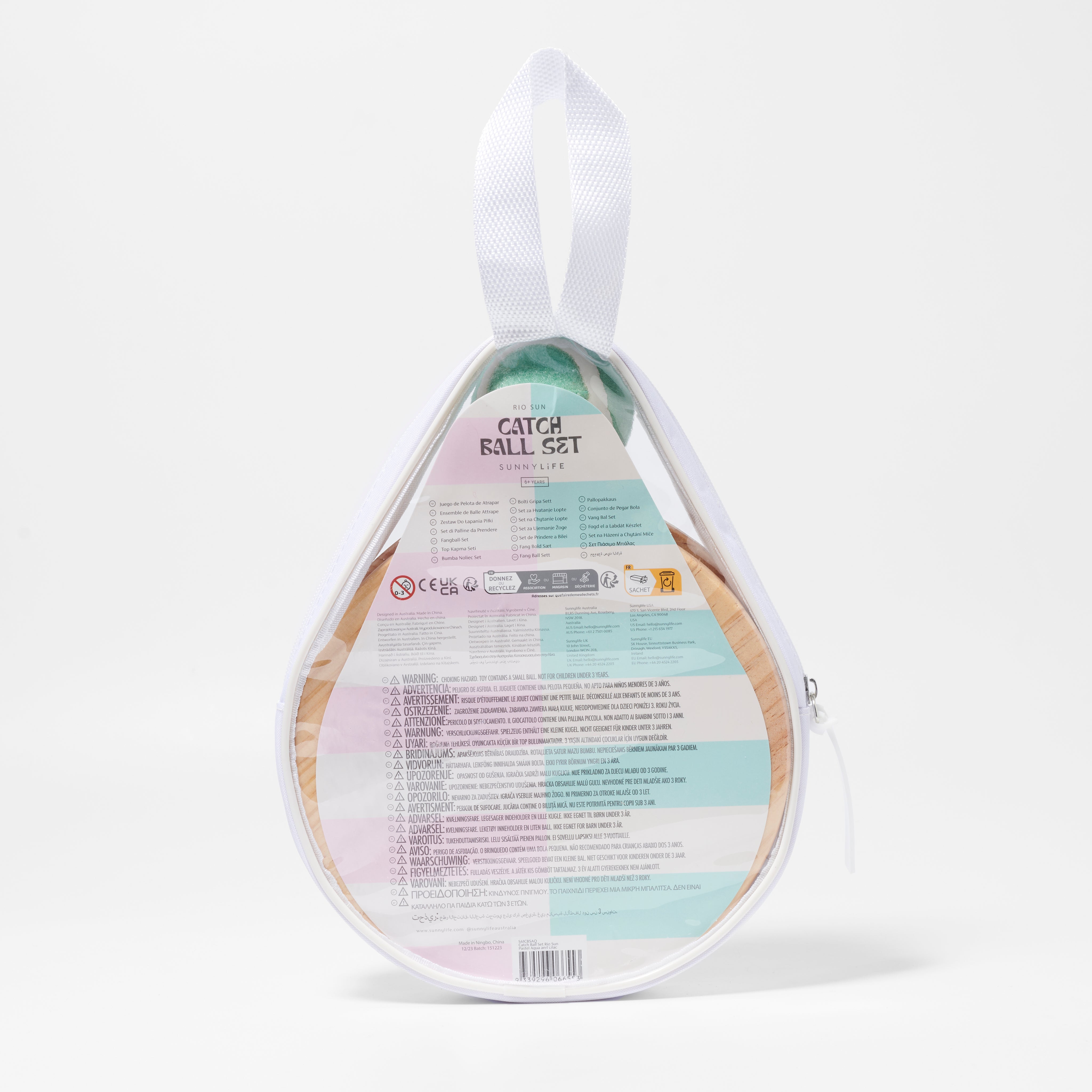 PLAY AWAY THE DAY Get ready to play away the day in style. The Rio Sun Catch Ball Set is ultra-trendy and vibrant, designed to make a statement. Made from durable and lightweight material and comes complete with two Velcro wooden mitts, one branded SUNNYLiFE ball, and a handy carry bag, grab a partner, hit the seaside, and serve up some serious fun. Turn heads and ensure this season is one to remember with their sweet pastel colourway. Rubber wood & composite board of basswood. Includes x2 Velcro catching bats and x1 flocked ball. Adjustable velcro strap for a firm and comfortable grip. Suitable for the whole family. Reusable carry bag packaging for easy storage.
