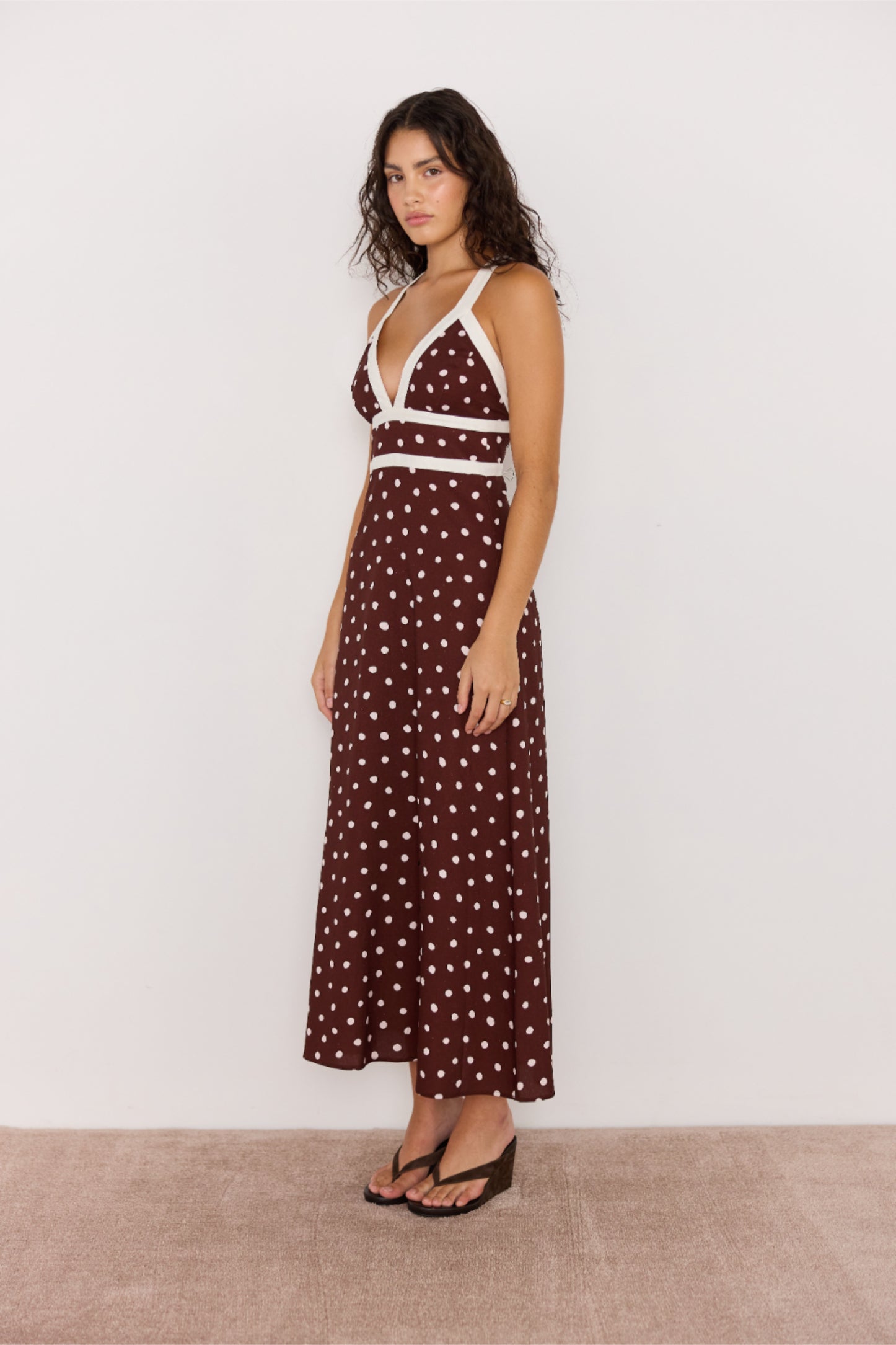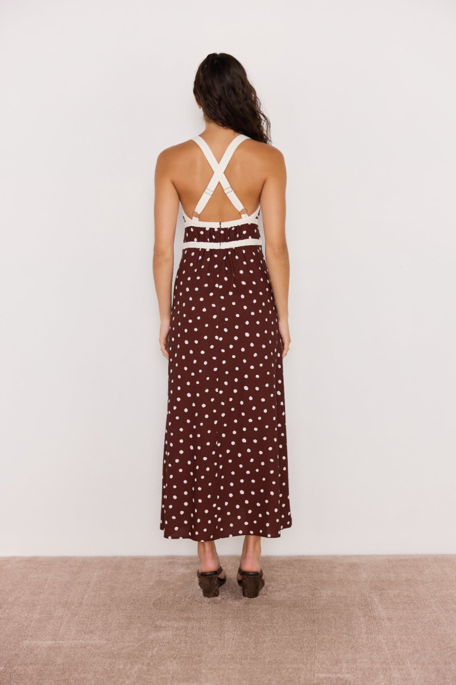 The Cedar Cross Back Dress brings playful charm with a touch of vintage flair. Designed in a chocolate brown hue with a crisp white polka dot print, this midi is all about the details - think contrast binding, a deep V-neckline, and flattering under-bust seam. The cross-back straps add a statement finish, while the soft, floaty fabric keeps things light and breezy. Perfect for sunny days, date nights, and everything in between. Style with sandals or elevate with a platform heel.