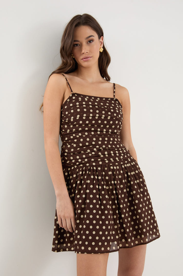 FLORENTINE POLKA DOT PLEATED MINI DRESS - CHOCOLATE