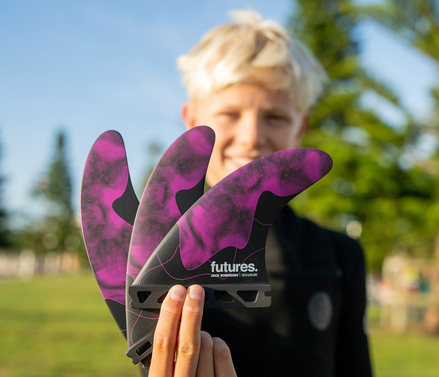 Jack Robinson's signature Honeycomb thruster fin is a small size fin in the Rake template category. Developed to suit Jack's style of surfing above and below the lip, he has been putting it through the paces at some of the best waves in the world with incredible success. The Honeycomb construction feature a balanced flex pattern that provide a perfect blend of lively and stable performance in all wave types. The center fin is smaller than the side fins for increased maneuverability.
