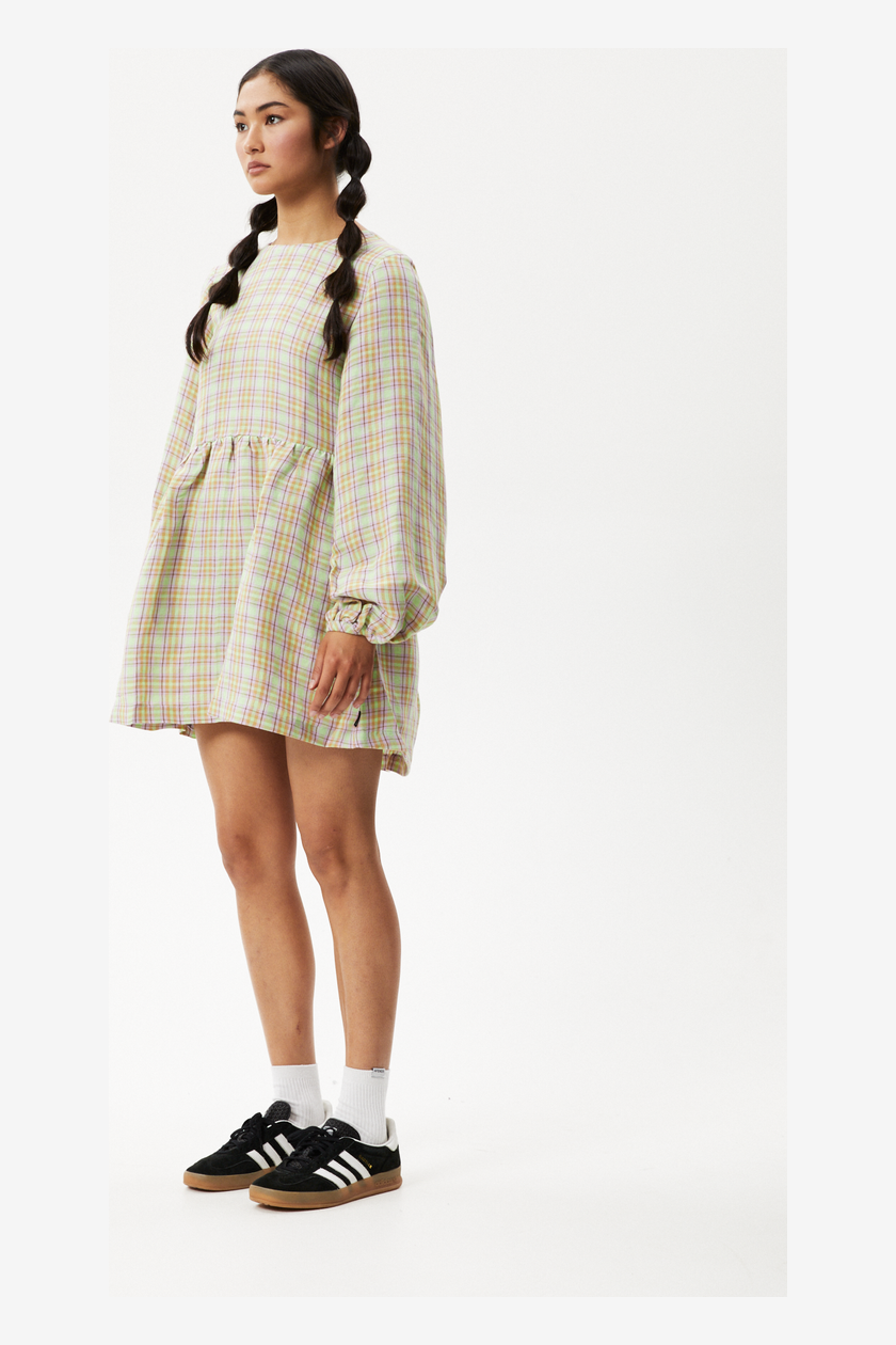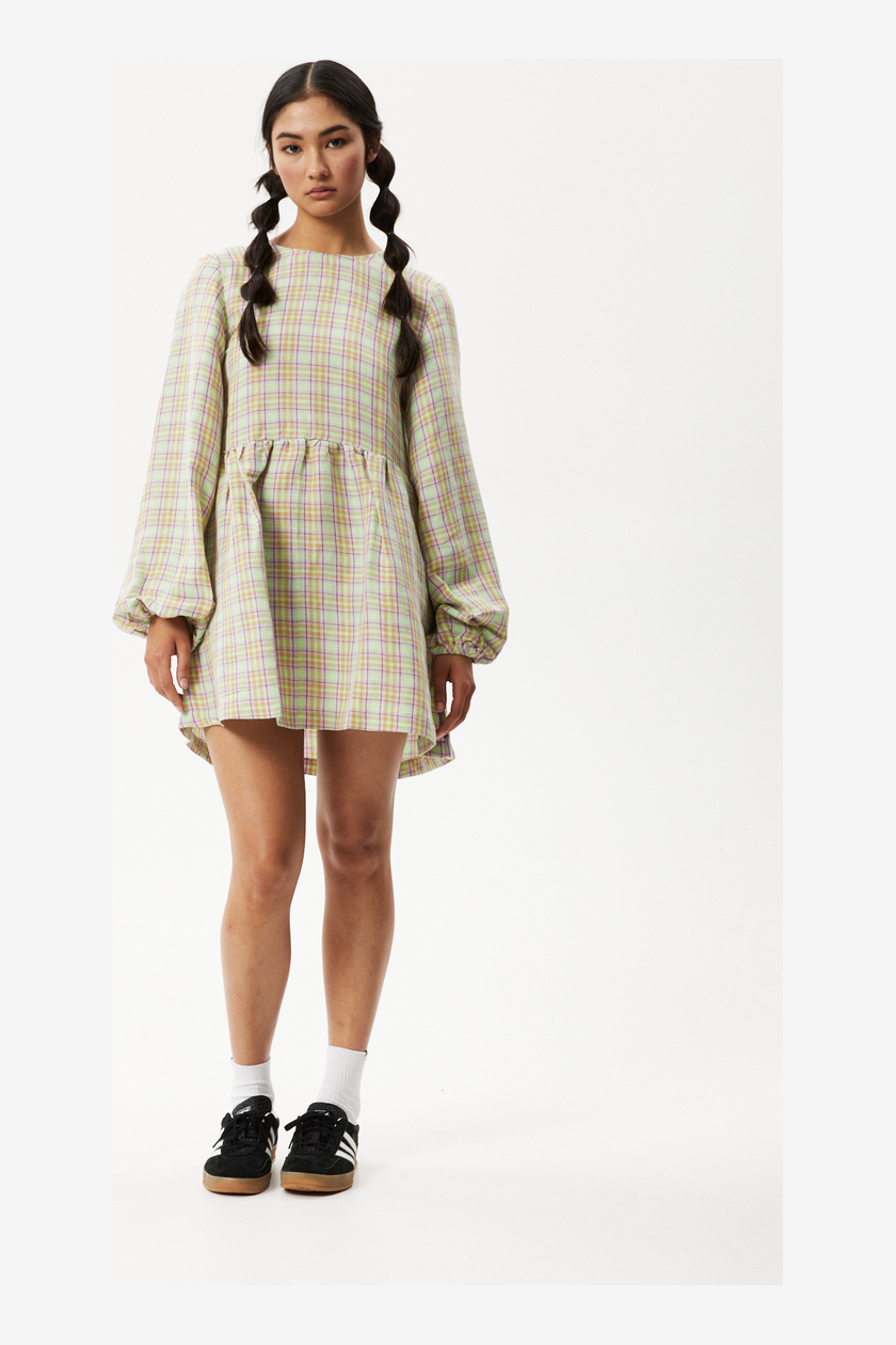 Take this long sleeve mini dress to dinner. Enjoy a soft and lightweight handfeel crafted from a sustainable blend of hemp and tencel and detailed with a feminine pistachio check pattern. Cut in our long sleeve mini silhouette, you can expect a relaxed and flowy fit with balloon-sleeves and a low scooped back with tie detail. Just pair her with knee high boots and hit the town.