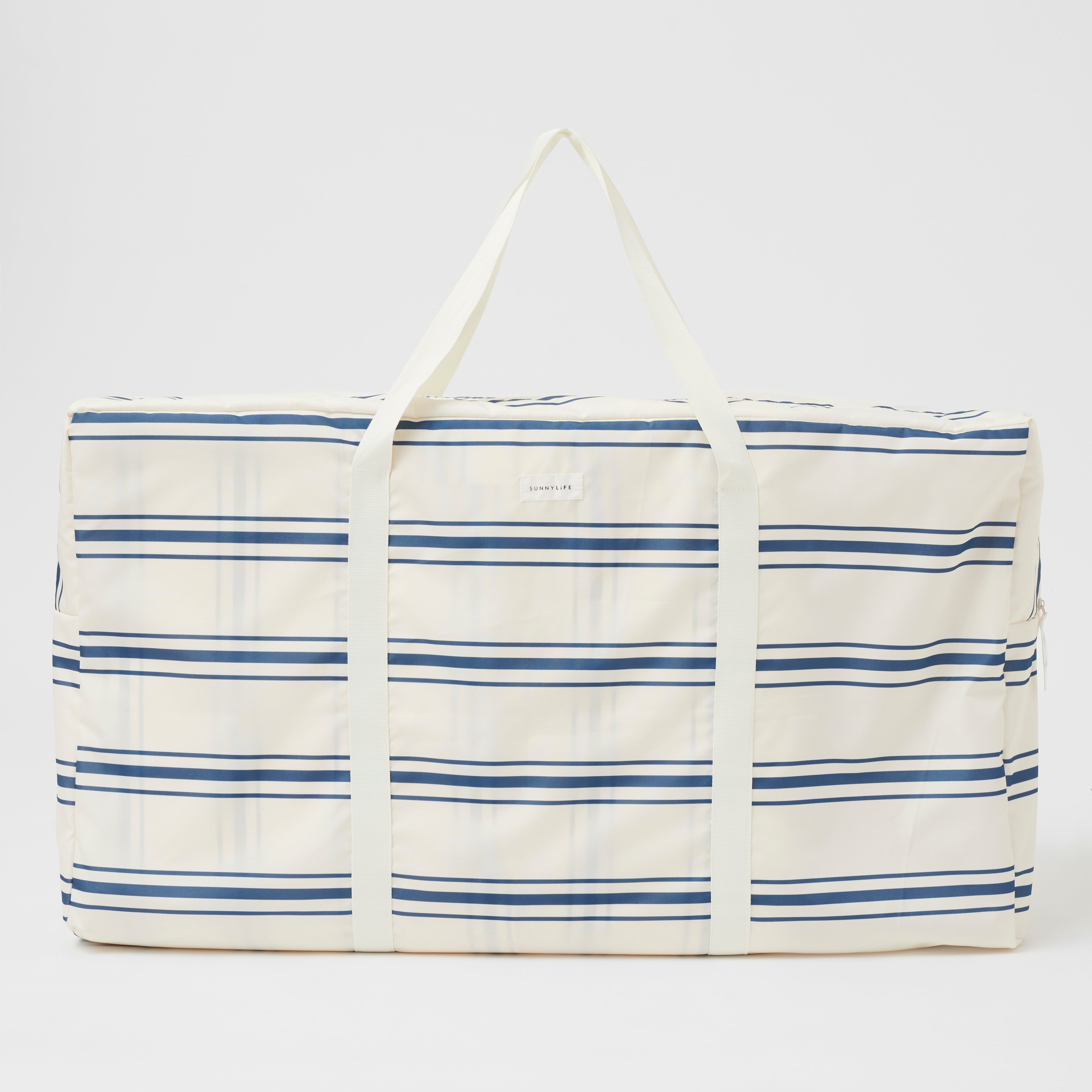 RECLINE IN COMFORT Recline in comfort with the most premium outdoor seat. The Resort Luxe Lounger Chair has everything you could want to lean into all summer long. Designed with a matching carry bag and 6 adjustable reclining settings for the head, waist, and legs, this chair will be your new ‘can’t live without’ sunshine essential. From the comfort of your own home, unwind, read, and bask in the warmth of the sun. Soak up your surroundings in style with its vintage stripe print and nautical colour scheme that will have you transported to nostalgic holidays of the past.