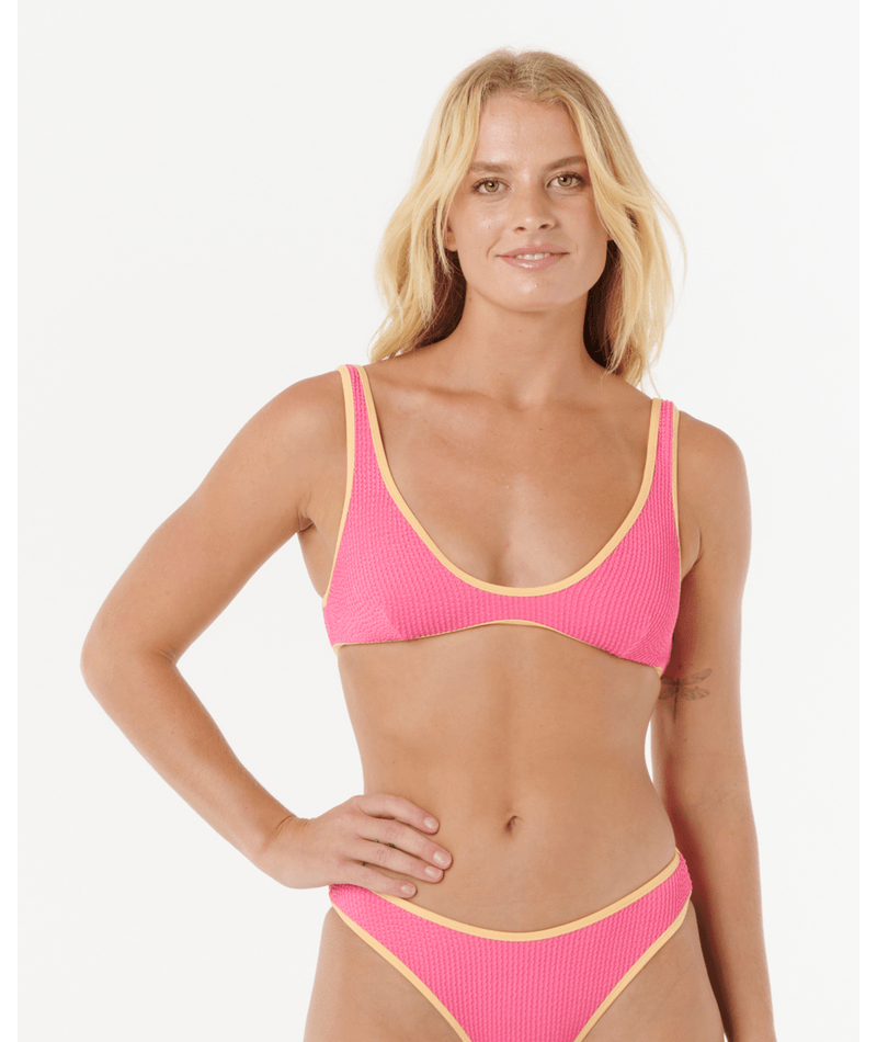 The Luxe Surf Bralette delivers good support with stretch crinkle fabric and a fully lined design. Removable padding lets you customize the fit, while the sleek metal logo trim adds a refined touch to this essential surf-ready piece.