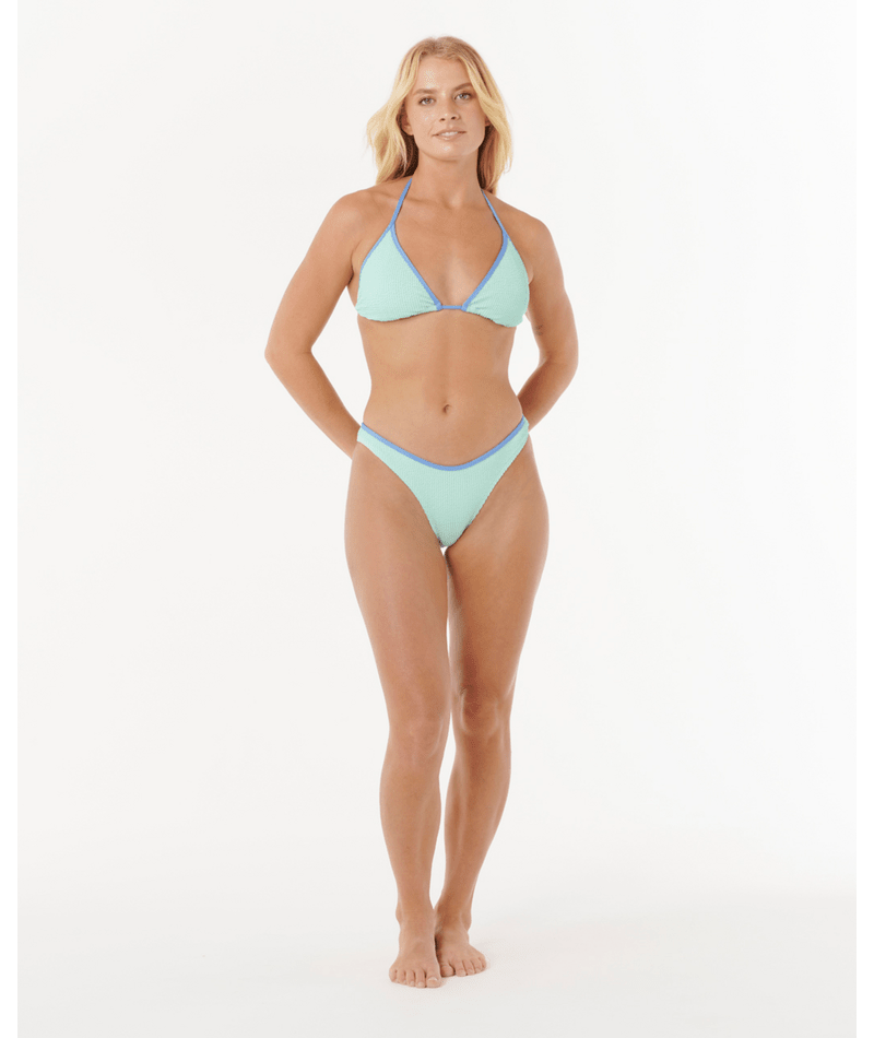 Designed for confident movement, the Luxe Surf High Cut Cheeky Coverage Bikini Bottom features fully lined stretch crinkle fabric and a flattering high-cut leg. The metal logo trim adds a sleek surf-inspired finish.