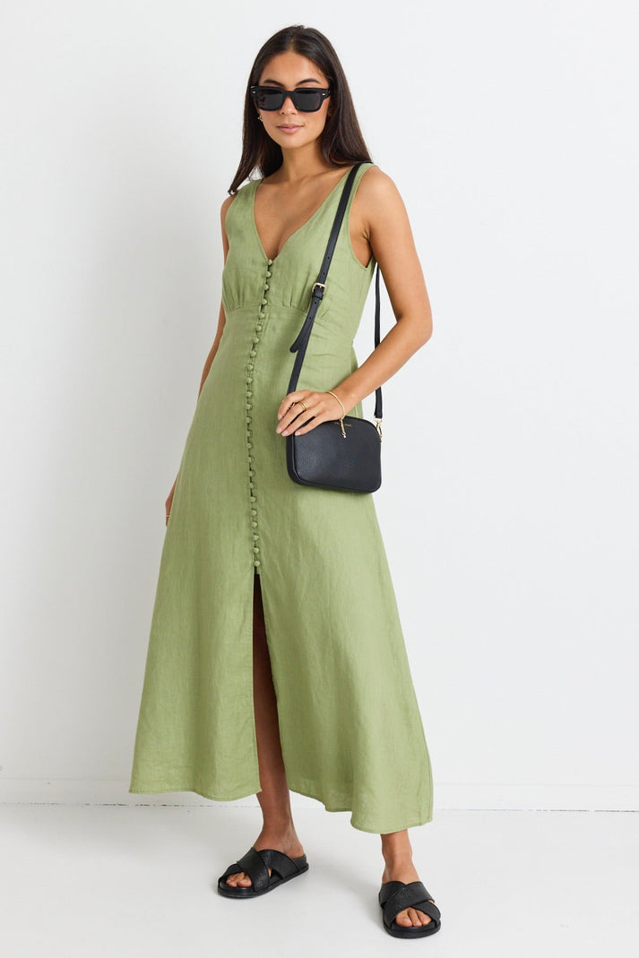 This elegant linen midi dress from Among The Brave is the definition of effortless, with its flowing A-line silhouette and timeless design. Crafted from breathable lined linen, it offers a comfortable yet chic look. The dress features delicate covered buttons that run down the front and a subtle front split. Perfect for warm-weather occasions or casual outings, this dress combines style and ease.