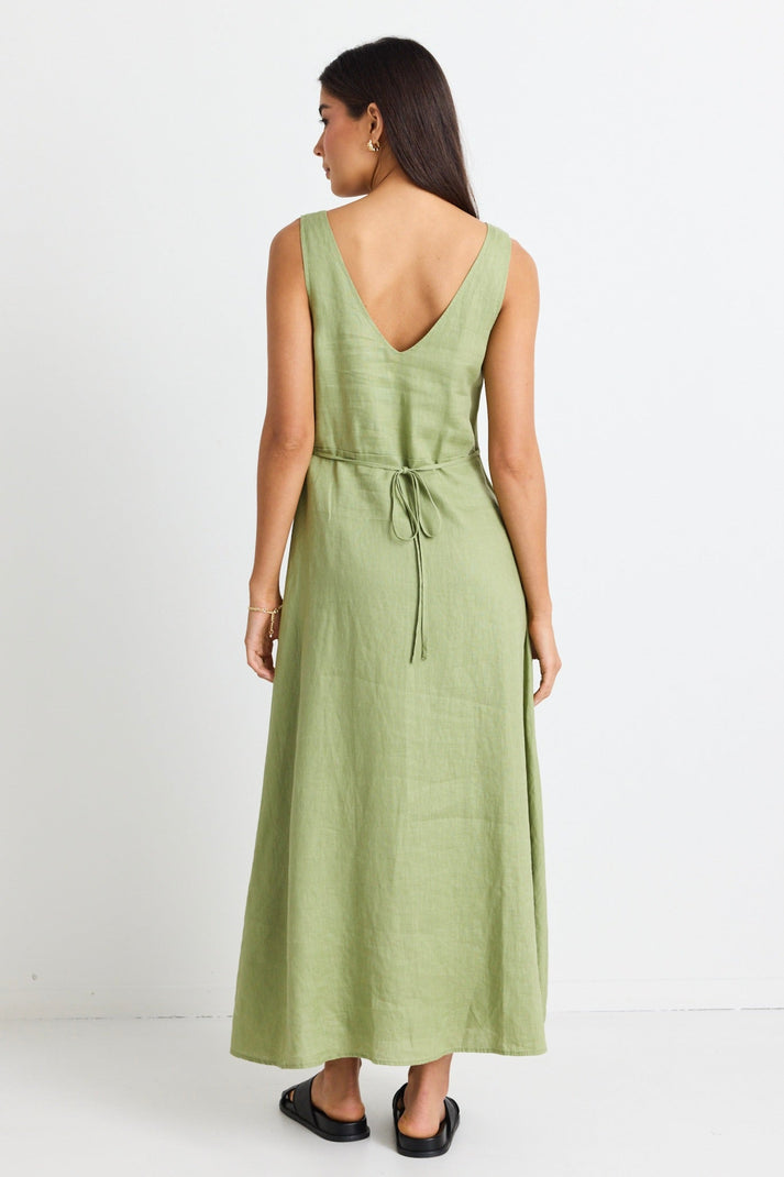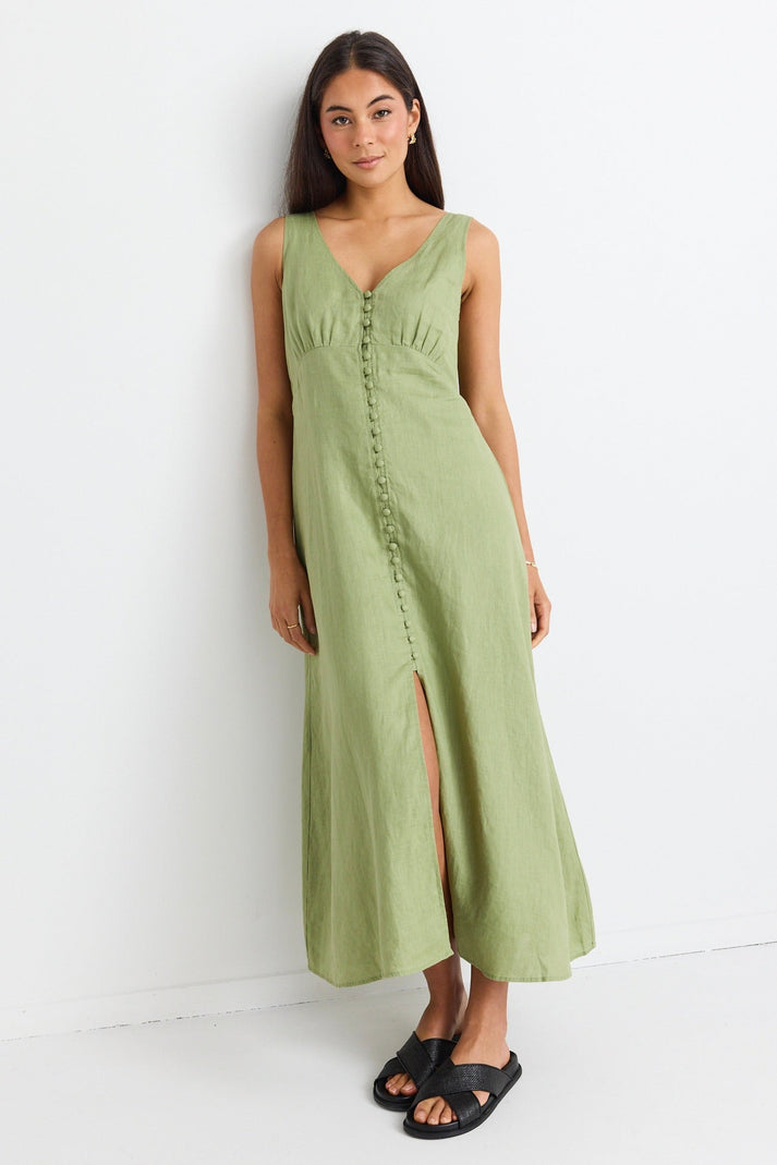 AMONG THE BRAVE PANAMA SLEEVELESS BUTTON FRONT MIDI DRESS - MOSS