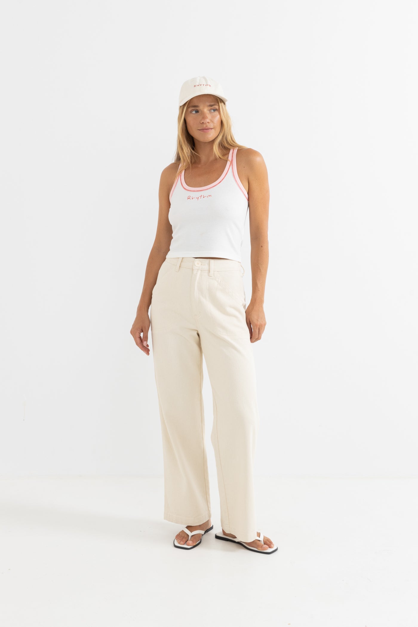 A simple essential, the Rhythm Tank in White is slim-fitting and cropped, finished with tonal neck and armhole binds and a small embroidered chest detail.
