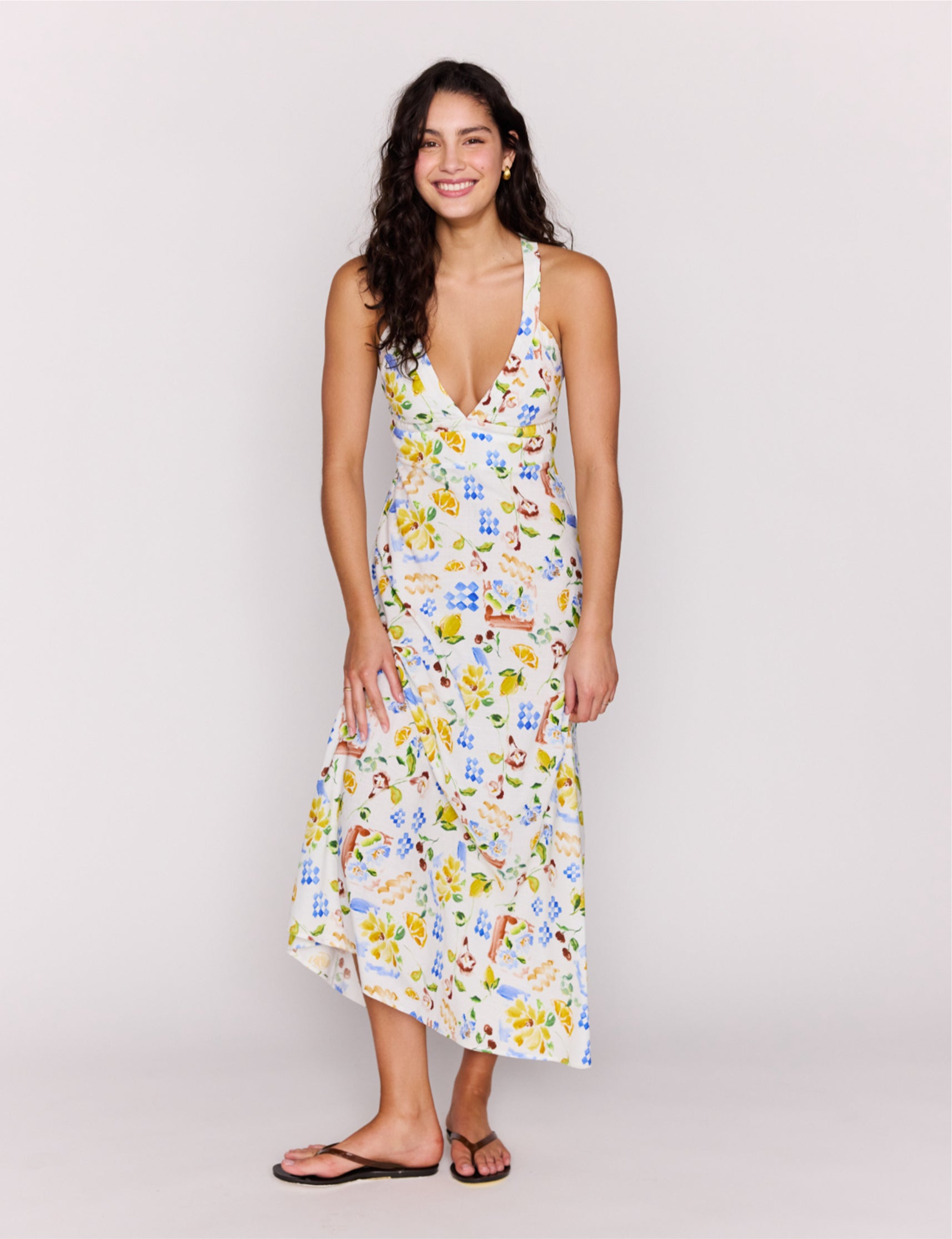Your summer plans, sorted. This midi dress features a flattering V-neckline, relaxed midi length and a statement cross-back detail that adds just the right amount of drama. Finished in a fresh Riviera-inspired print, it’s lightweight, breathable and made for warm days that turn into long nights. Easy, effortless and endlessly wearable.