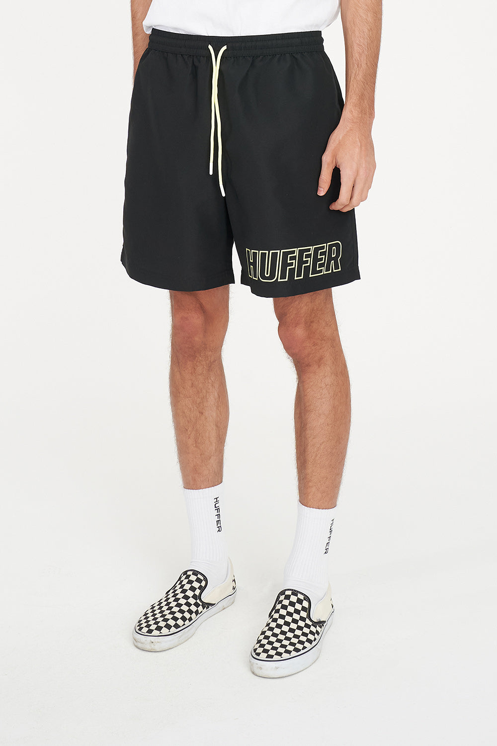 100% Polyester Microfibre / Quick dry / Mechanical stretch / Classic streetwear fit / 3 pocket detail / Elasticated waistband with drawcord / Huffer branded placement print