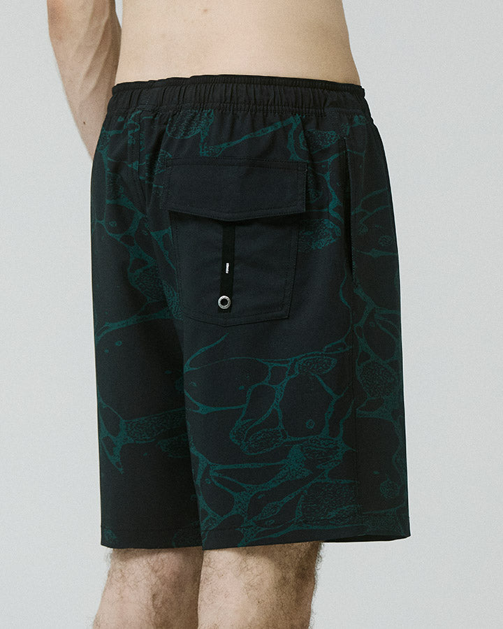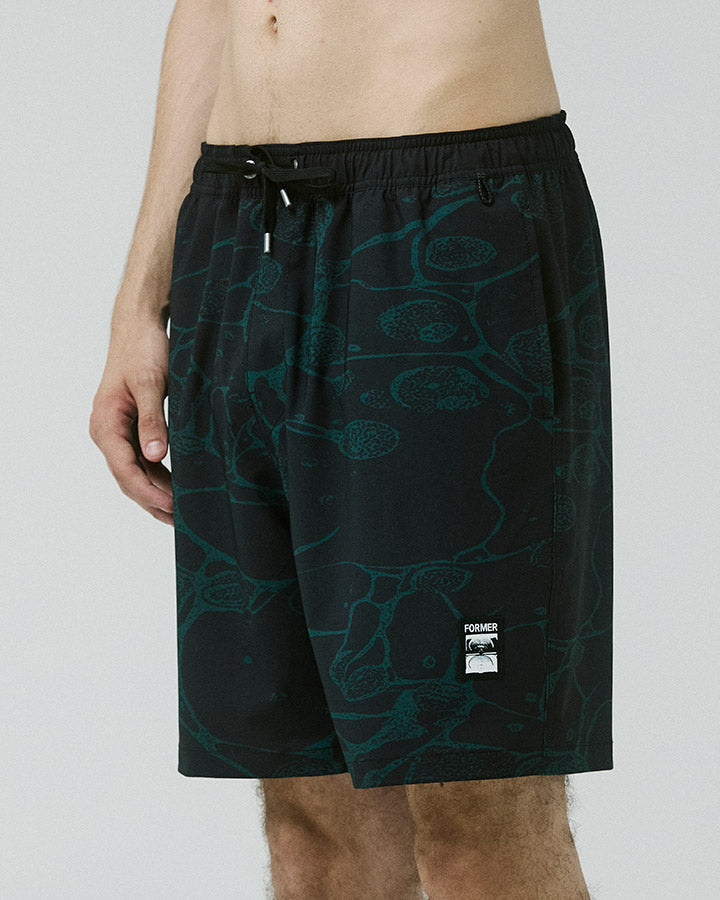 Constructed from a premium polyester-spandex blend (90% polyester 10% spandex) 4-way stretch fabric with a pigment print and vintage wash finish. Delivered in our standard FORMER 19" trunk fit. Featuring signature velcro back patch pocket with FORMER webbing and eyelet, drawcord closure with Franchise F metal aglets, elastic key loop, and fixed waist.