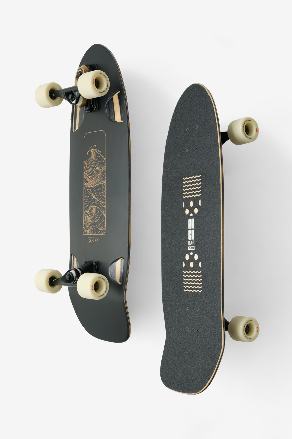The Walrus - Black/Peaking is our ultra wide surf/skate cruiser with built-in arch bar for locked-in control during surf-like manoeuvres. 10.25" x 31" x 16" wb of Resin-7 hard rock maple rolling on Slant Surf/Skate trucks and 83a Dragster wheels with die-cut griptape. Try it and feel the difference!