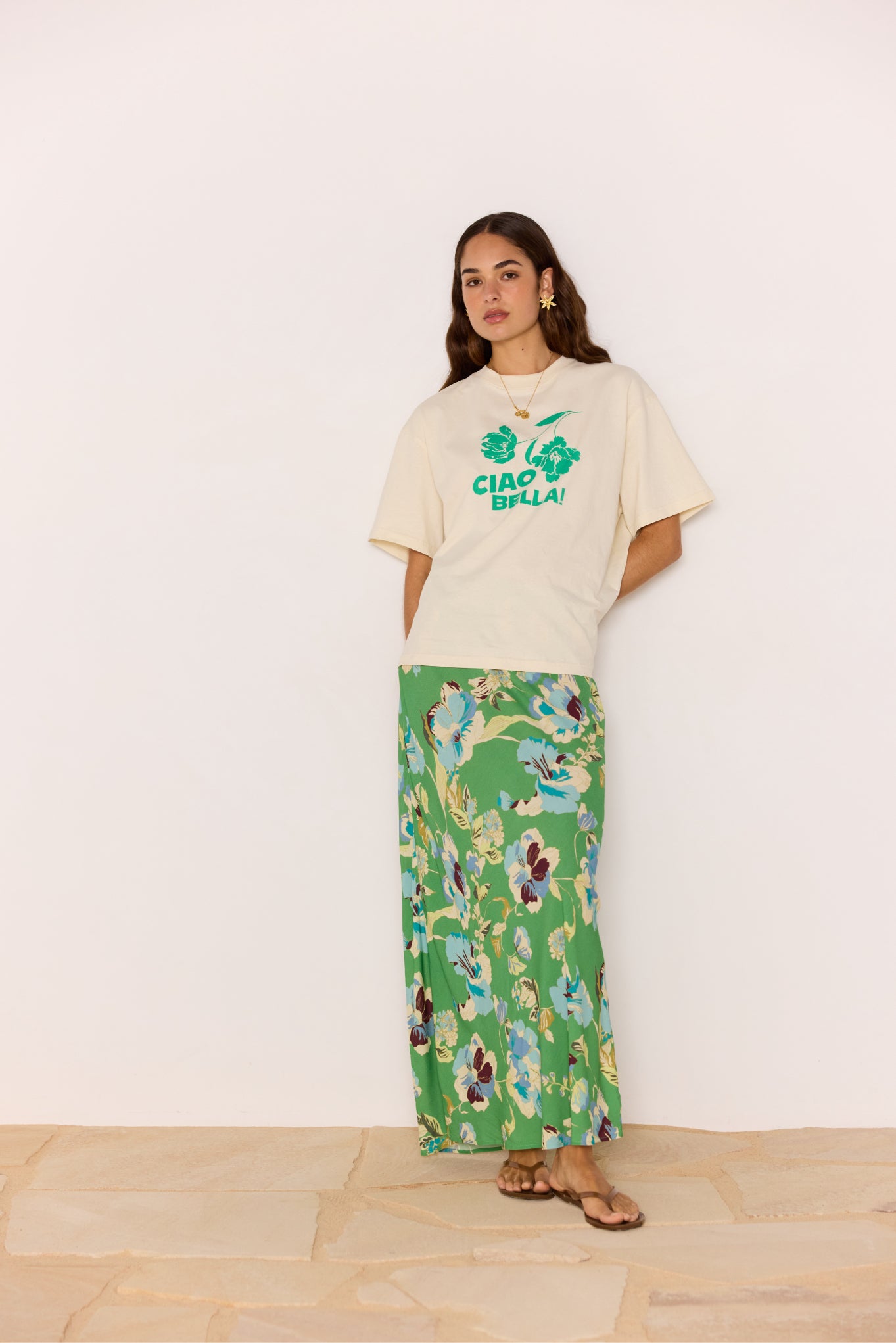 The Zoe Green Floral Bias Midi Skirt brings effortless elegance to everyday dressing. Cut on the bias, this skirt skims beautifully over the body, creating a flattering silhouette. Crafted from lightweight viscose in the same vibrant green floral print, it’s designed to move with you - perfect for day parties, weekend getaways, or long summer lunches.
